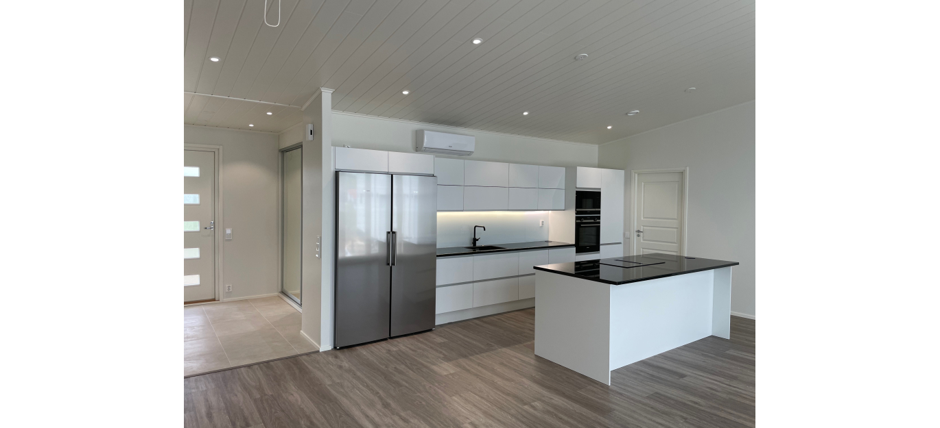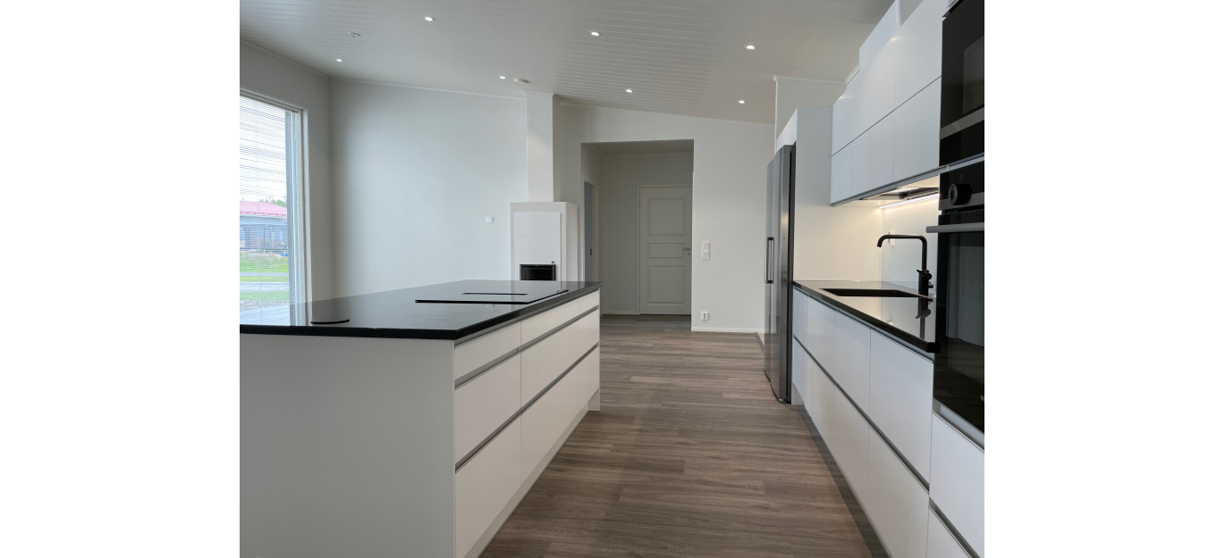 Muiden oleskelutilojen yhteydessä oleva, mitoitukseltaan ylellinen keittiö yhdistyy kätevästi kodinhoitohuoneeseen. Kodinhoitohuoneeseen piiloutuu hätätilanteessa arjen jäljet yllätysvieraiden saapuessa. Keittiön ei tarvitse näyttää työtilalta, vaan se voi olla ilmeeltään yhtälailla tyylikäs ja ylellinen kuin muukin sisustus.